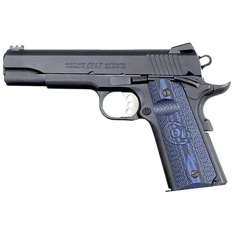 Colt’s 1911 Competition pistol features custom G10 blue grips with a scallop texture and the Colt logo, dual recoil spring system, a National Match barrel. It has Novak sights for precision shooting; a fiber optic front with adjustable rear sight. It comes with a magazine and spare sight fibers. This model has a blued carbon steel metal finish and a 70 series firing pin system.