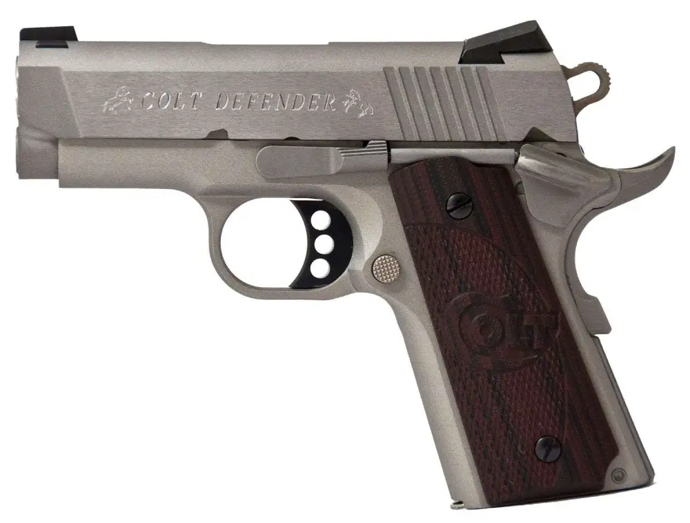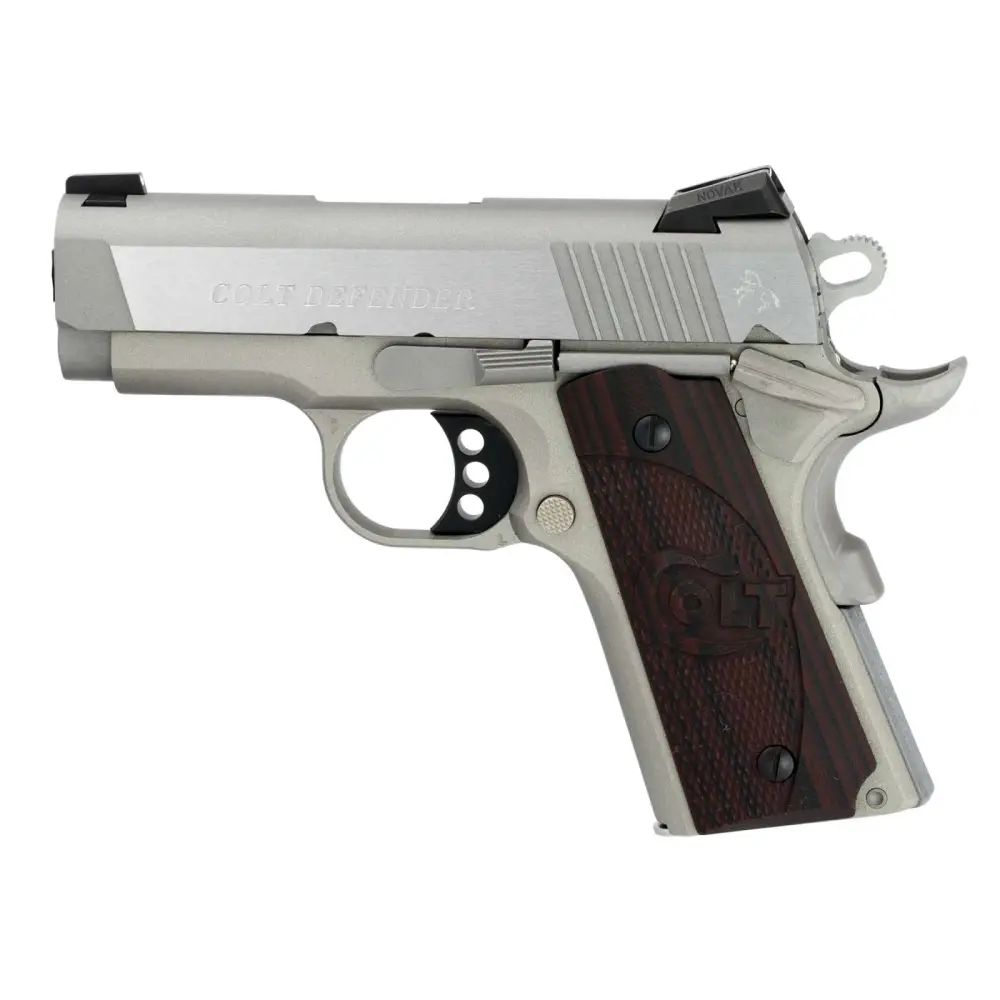 This Colt Defender pistol is a carry-ready 1911 in a compact size. It features a lightweight aluminum frame with a corrosion resistant stainless steel slide and G10 grips with partial checkered black cherry finish. The Defender has an upswept beavertail grip safety which this makes this small pistol very comfortable to shoot. Comes with 1 magazine.