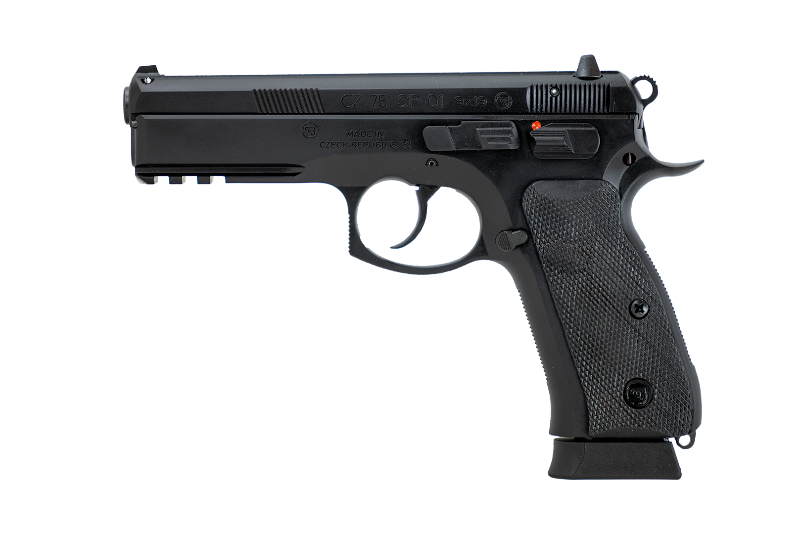The CZ 75 SP-01 is the first full size handgun (4.6″ bbl) from CZ to feature the improved manufacturing technology and ergonomics of the NATO-approved CZ 75 Compact P-01 model. Based on the CZ 75 DA/SA platform, the SP-01 features an integral 1913 accessory rail on the dust cover, rubber grip panels, and CZ’s corrosion resistant black polycoat finish. It utilizes an extended beavertail to protect the shooter’s strong hand as well as allowing for a deeper and more secure grip. The grip geometry, checkering in key areas on the front and back straps, and redistribution of mass provided by the accessory rail noticeably decrease the perceived recoil from previous models, and allows for more rapid target acquisition and transition. The SP-01 was designed as a military and duty sidearm, and thanks to its exceptional accuracy and superior handling characteristics, the CZ 75 SP-01 has also found supporters in the field of sport and target shooting. This CA Compliant model has 3-dot night sights, a 10+1 9mm Luger capacity, and utilizes a manual safety, safety stop on the hammer, and firing pin block safety.