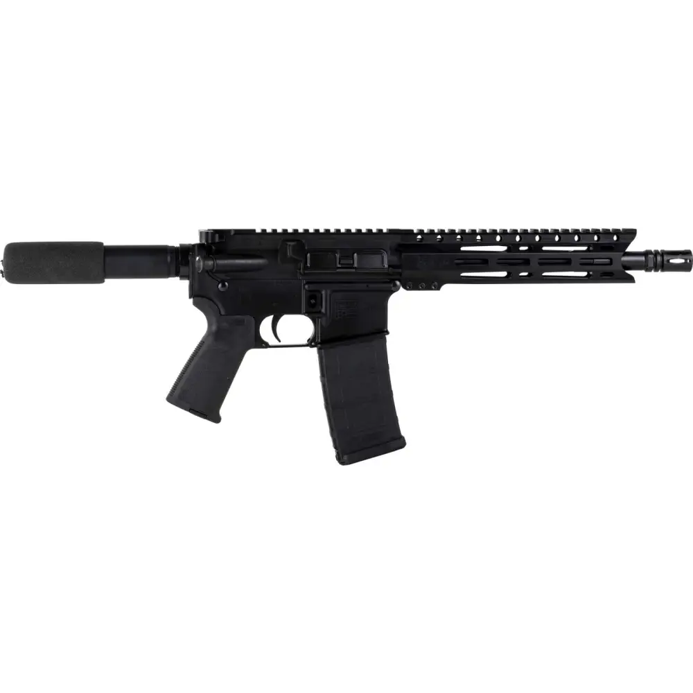 This DB15 Pistol features a carbine-length, medium, 4150 ChromeMoly barrel, pistol-length gas system, and a shot-peened Mil-Spec 8620 bolt carrier. It has 7075-T6 aluminum receivers, 9″ M-Lok handguard, Magpul MOE grip, and a buffer tube foam pad.