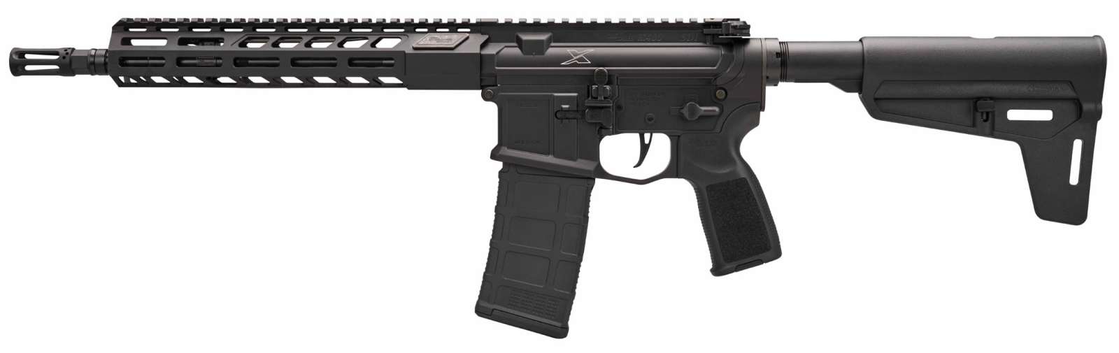 Ambi Bolt Catch/Release Safety Selector Charging Handle and Mag Catch – Low-Profile Gas Block with Carbine Length Gas System – 2-Stage Flat Blade Match Trigger – 11.5 Cold Hammer Forged Steel Barrel – Free Floating M-LOK Handguard – Hybrid Compensator/Flash Hider – Magpul BSL Telescoping Brace – CALIBER 5.56 NATO – FRAME MATERIAL ALLOY – FRAME FINISH ANODIZED – BARREL MATERIAL HAMMER FORGED CHROME MOLY – BARREL FINISH FNC – MAGAZINE CAPACITY 30 ROUNDS – SIGHTS OPTIC READY – TRIGGER 2-STAGE FLAT BLADE MATCH – OVERALL LENGTH 30.2 in – OVERALL HEIGHT 7.1 in – OVERALL WIDTH 2.8 in – BARREL LENGTH 11.5 in – BARREL TWIST 1:7 in – WEIGHT W/MAGAZINE 5.8 lb
