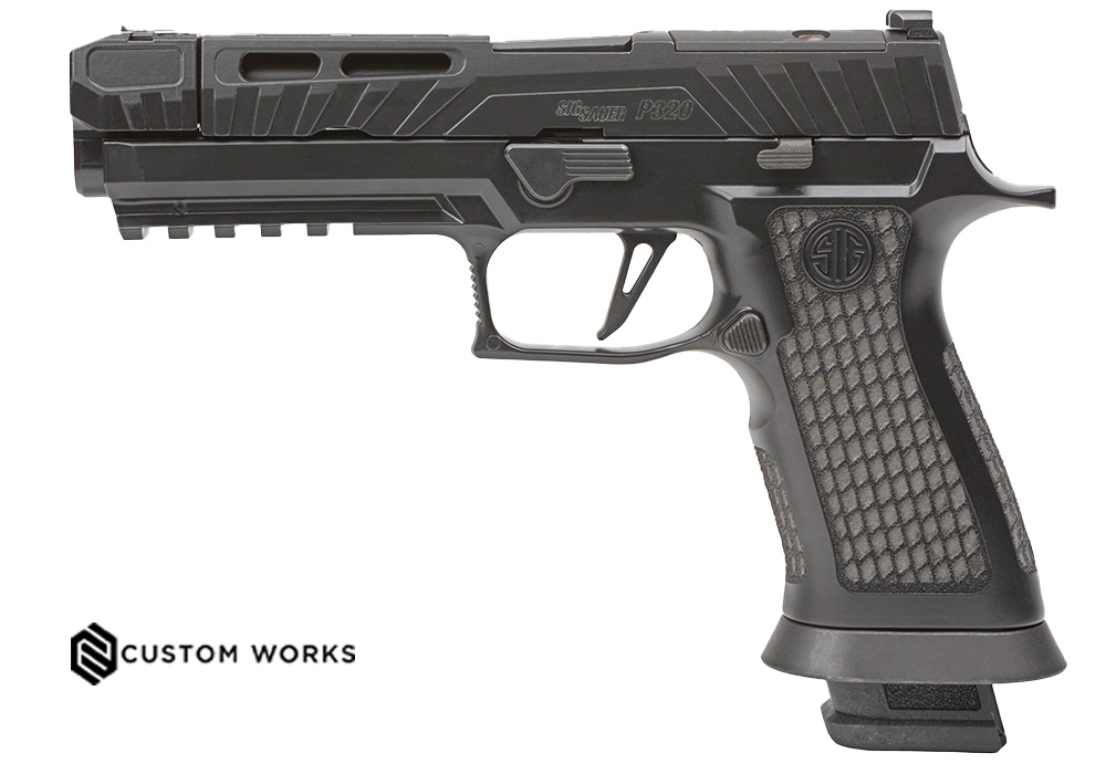 Laser Engraved Blackout Cerakote Tungsten XSeries grip module – Custom Works Spectre Blackout Cerakote optic-ready slide – Threaded Barrel with mounted single-port Compensator – XSeries Flat Skeletonized Trigger – XRay3 Day/Night Sights – (2) 21rd or (2) 10rd Steel Magazines – CALIBER 9MM – FRAME MATERIAL STAINLESS STEEL – GRIP MODULE BLACKOUT CERAKOTE LXG – SLIDE MATERIAL STAINLESS STEEL – SLIDE FINISH BLACKOUT CERAKOTE – MAGAZINE CAPACITY 21 OR 10 ROUNDS – SIGHTS XRAY3 DAY/NIGHT SIGHTS – TRIGGER STRIKER FIRED W/ XSERIES FLAT SKELETON TRIGGER – OVERALL LENGTH 8.5 in – OVERALL HEIGHT 5.8 in – OVERALL WIDTH 1.6 in – BARREL LENGTH 4.6 in – SIGHT RADIUS 6.5 in – WEIGHT W/MAGAZINE 41.8 oz