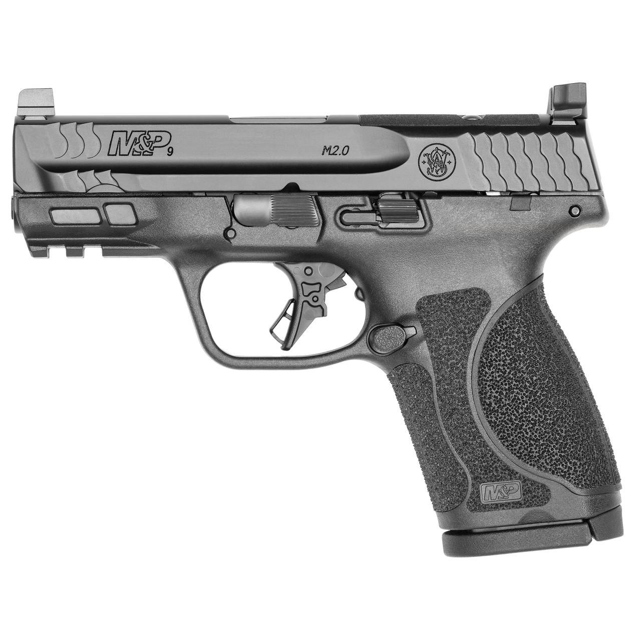 Smith & Wesson M&P 2.0, Striker Fired, Semi-automatic, Polymer Frame Pistol, Compact, 9MM, 3.6″ Barrel, Armornite Finish, Black, Optic Height Sights, Optics Ready, Thumb Safety, Flat Face Trigger with Integrated Trigger Safety, 15 Rounds, 2 Magazines 13571