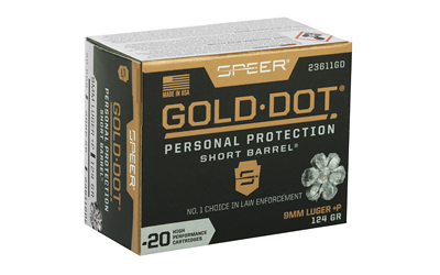 Gold Dot was the first handgun ammunition loaded with true, bonded-core bullets. Using an exclusive Uni-Cor(R) method, Speer bonds the jacket to the core one molecule at a time at the very beginning of the bullet construction process. This virtually eliminates core-jacket separation. With options for both standard handguns and short barrels, there’s a Gold Dot load to fit any shooter. Each Gold Dot hollow point cavity is tuned by specific caliber and bullet weight to ensure optimum performance. Speer forms the hollow point cavity in two stages. The first establishes how far the bullet can expand; the second controls the rate of expansion. This patented two-step cavity formation gives Speer engineers incredible control in the design process. Each bullet caliber and weight is tuned for optimum expansion and penetration. The bullet is then finished to provide a smooth profile for reliable feeding in semi-automatic handguns. To ensure Gold Dot performs when you need it most, they first make sure it excels in the stringent tests developed by the Federal Bureau of Investigation for service-class handgun cartridges. These protocol tests evaluate penetration, expansion and retained weight in bare gelatin and gelatin shielded by common barriers.